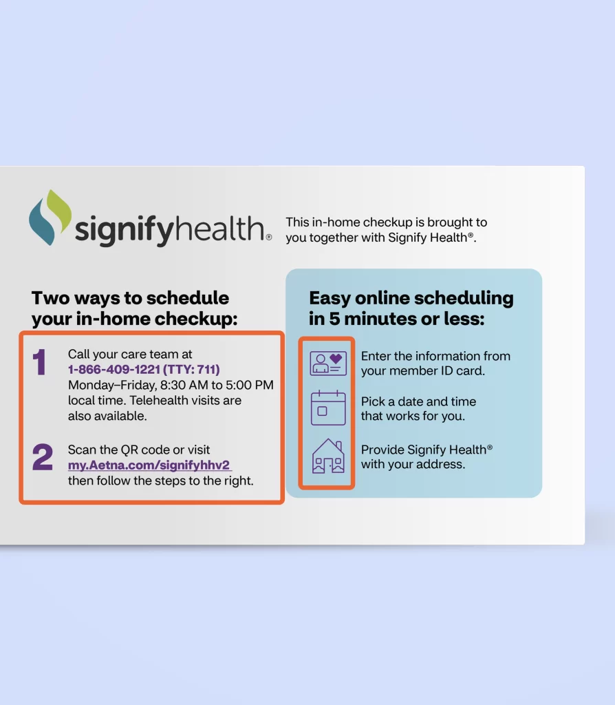 I got to put this into practice on a recent project for Aetna. They needed a direct mail campaign for their Medicare members, and the challenge was communicating clearly and accessibly while staying within strict brand guidelines. My role was to design a piece that felt approachable, built trust, and kept the brand consistent across both print and digital.